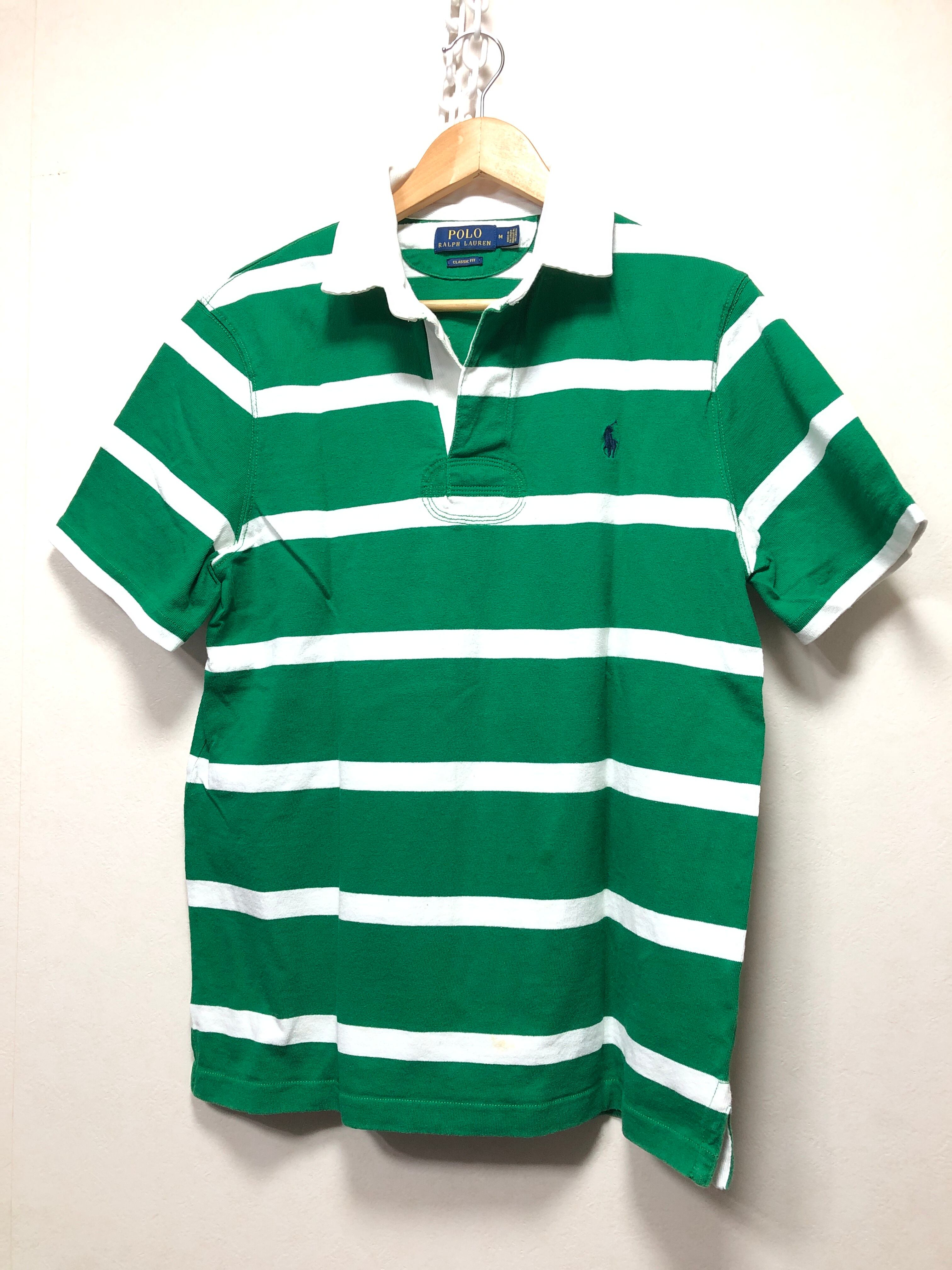 504022 POLO RALPH LAUREN CLASSIC FIT 半袖 ボーダー ラガーシャツ M ホワイト グリーン ポロシャツ ポロ ラルフローレン